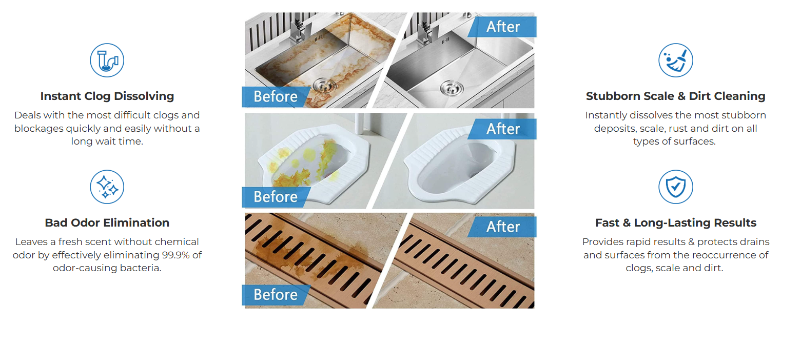 Pour the Wild Tornado™ Cleaner into the clogged drain or sink. Use half a tube of powder for preventative purposes and a whole tube to remove difficult clogs. To combat scale - sprinkle powder on the surface. Allow the powerful formula to work its magic. Let it sit for 5-10 min to dissolve clogs & plaque (in complicated cases, wait 15 min). Flush the drain with water, revealing clean, free-flowing drains and sinks. It is recommended to use the product at least once a month to prevent clogs and the formation of ingrained plaque.